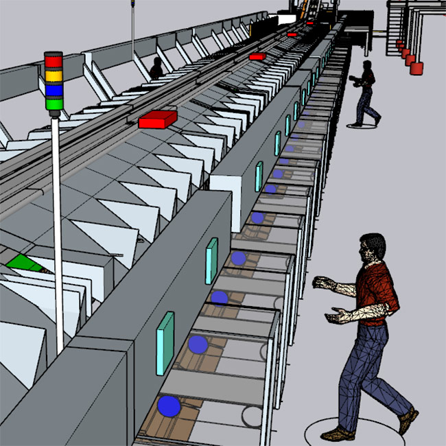 Designing an advanced, highly efficient and flexible control system capable of handling large volumes of packages with weights ranging from 100g to 10kg, minimising downtime and optimising staff deployment, within a highly automated and complex environment.